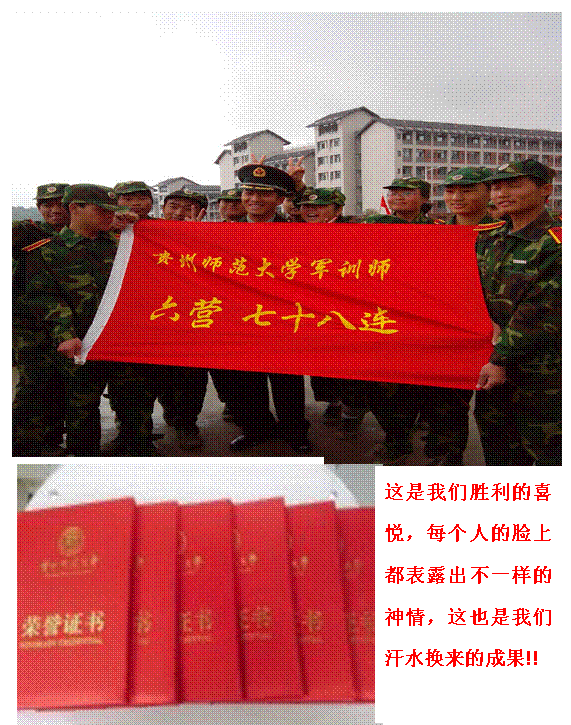 1、 在刚开学的军训期间,我们班的表现一直突出,在阅兵式时,我们班的肖薇是标兵,赵亮清是下口令的,还有肖桐是排头兵,在那个大家都不认识的时候,我们班的班长周凯一直在默默的为大家去抬水,解决大家口渴的问题,通过大家的齐心努力,最后我们不仅建立了友谊,而且我们的付出也得到了回报,我们的连队获得了“优秀连队”的称号,而且我们班的多位同学获得“优秀军训生”称号